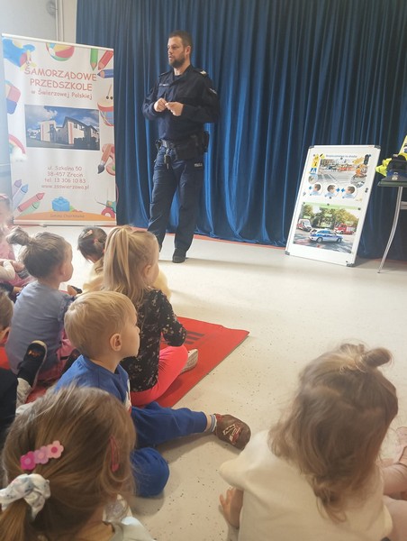 Na terenie Samorządowego Przedszkola w Świerzowej Polskiej odbyło się spotkanie profilaktyczne z policjantem. Celem zajęć była poprawa bezpieczeństwa najmłodszych poprzez popularyzację znajomości przepisów ruchu drogowego oraz uwrażliwienie dzieci na otaczające zagrożenia.