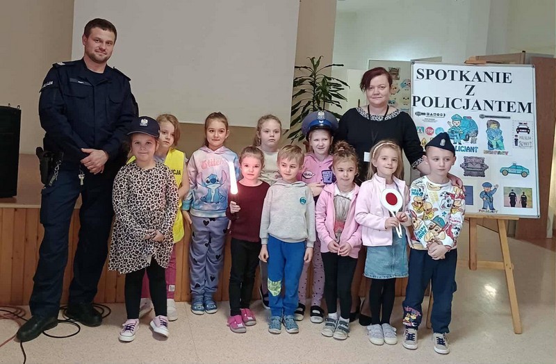 Sierż. szt. Paweł Lechowicz uczył najmłodszych, jak bezpiecznie przechodzić przez jezdnię, promując noszenie odblasków oraz zasady odpowiedzialnych zachowań na drodze. Dzielnicowy przypomniał numer alarmowy 112, a także sposoby unikania niebezpiecznych sytuacji w kontaktach z osobami obcymi. Omówił również zagrożenia czyhające na dzieci w cyberprzestrzeni.