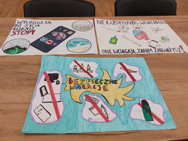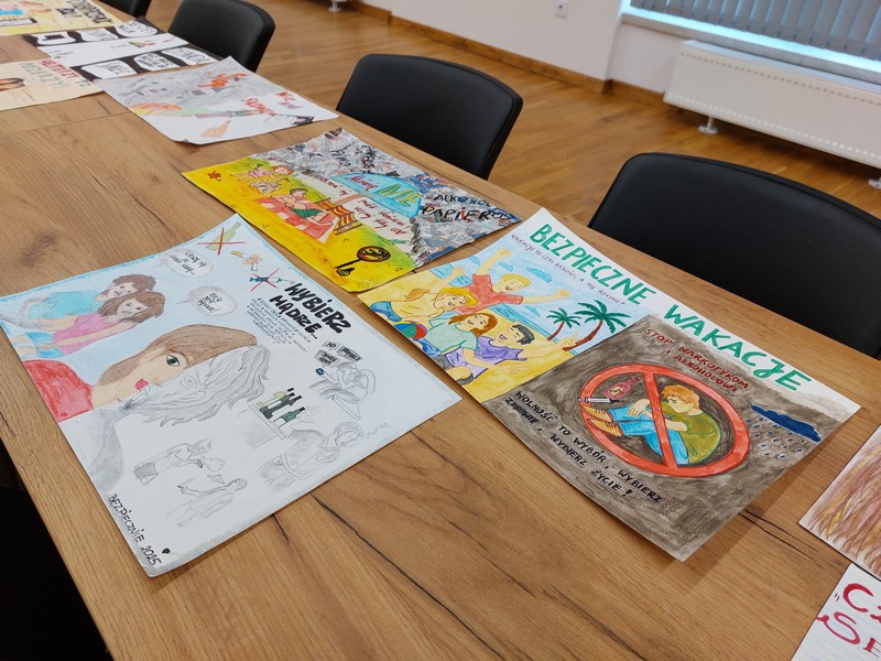 „Bezpieczne Wakacje" to konkurs, którego celem jest podniesienie poziomu wiedzy najmłodszych w zakresie czyhających zagrożeń oraz kształtowania asertywnych postaw wobec negatywnej presji otoczenia. Tematyka prac dotyczyła zagadnień agresji i przemocy rówieśniczej, a także profilaktyki uzależnień.