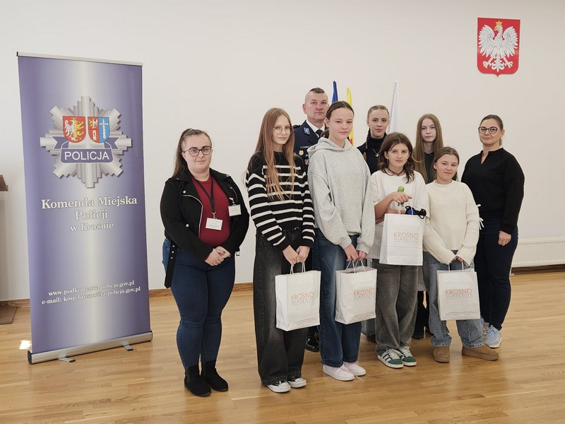 Uroczyste podsumowanie powiatowych zmagań odbyło się w siedzibie krośnieńskiej jednostki. Uczestnicy konkursu odebrali gratulacje z rąk mł. insp. Daniela Lendzio Komendanta Miejskiego Policji w Krośnie oraz kierownictwa Wydziału Prewencji miejscowej komendy. Partnerem projektu był Urząd Miasta Krosna, który włączył się w jego promocję i organizację.