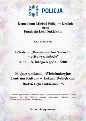 Komendant Miejski Policji w Krośnie oraz Fundacja Łęki Dukielskie zapraszają mieszkańców na debatę społeczną pod nazwą „Bezpieczeństwo Seniorów w cyfrowym świecie”. Debata odbędzie się 26 lutego br. o godz. 15, w Wielofunkcyjnym Centrum Kultury – Łęki Dukielskie 75.